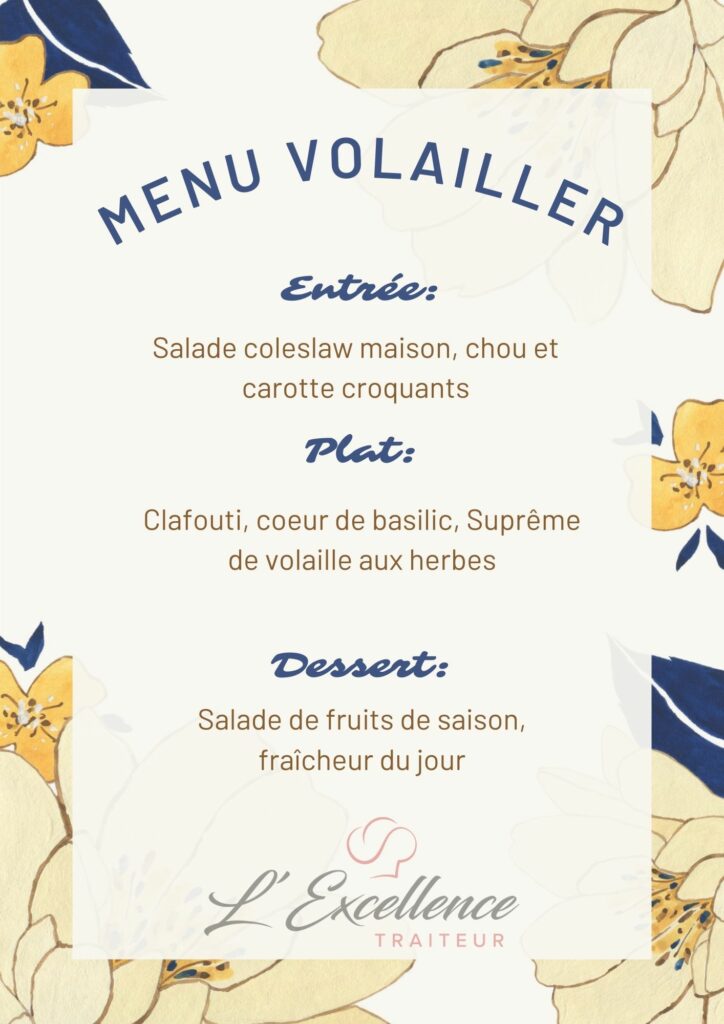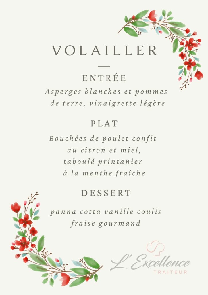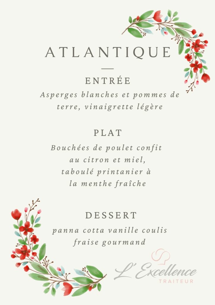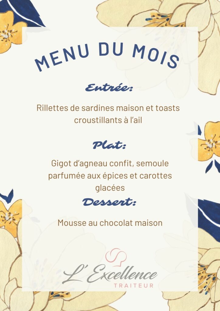 Nous vous proposons une gamme variée de menus : viandes, poissons, végétariens ou encore sans gluten – afin de répondre aux envies et besoins de chacun.
